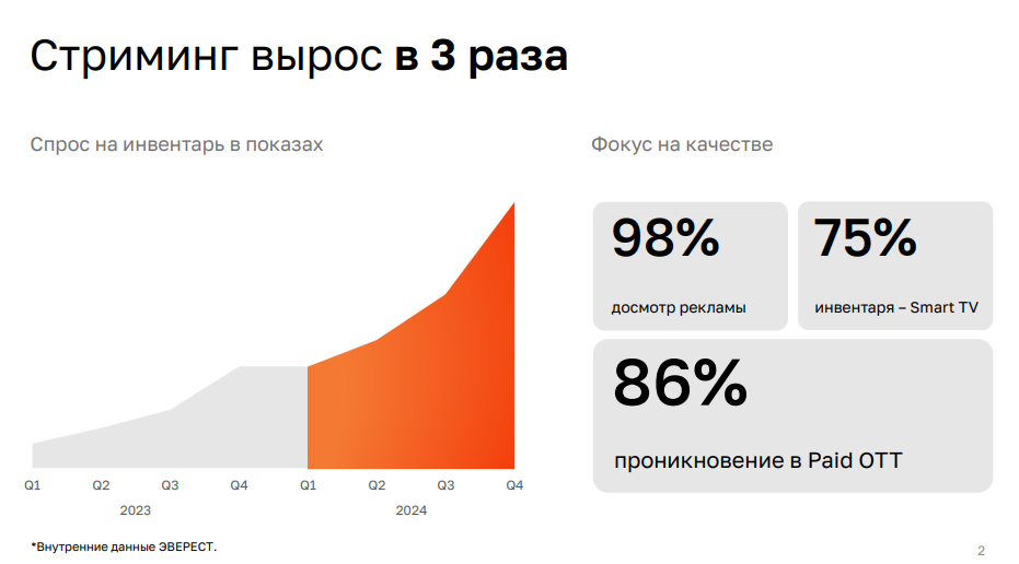 В феврале 2025 года команда сейлз-хауса ЭВЕРЕСТ исследовала стриминг в Смарт ТВ с разных сторон. Исследование было проведено совместно с технологическим партнером getads, который разработал анкету-креатив и предоставил инфраструктуру для сбора и передачи данных. По результатам проведения удалось выяснить, что стриминг — это рекламный инвентарь с высоким уровнем досмотра, основанный на просмотре контента на больших экранах и позволяющий эффективно охватить труднодостижимую аудиторию.
