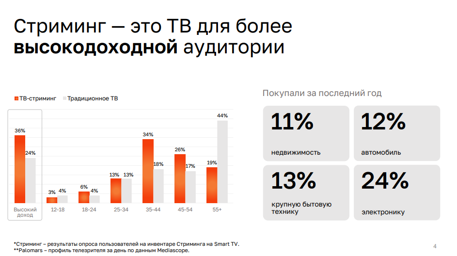 Удалось установить, что аудитория стриминга более молодая, более высокодоходная и платежеспособная, чем та же аудитория ТВ — за последний год представители аудитории стриминга покупали недвижимость (11%), электронику (24%), крупную бытовую технику (13%) и авто (12%).