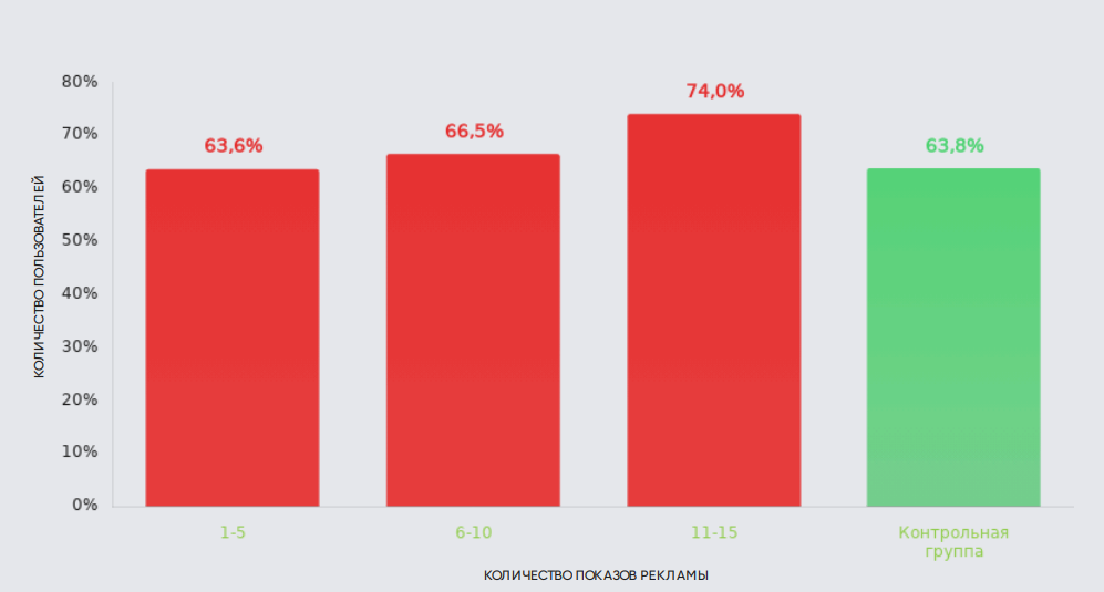 Наибольший эффект на рассмотрение к покупке от количества просмотров рекламы наблюдаются при 11–15 показах.