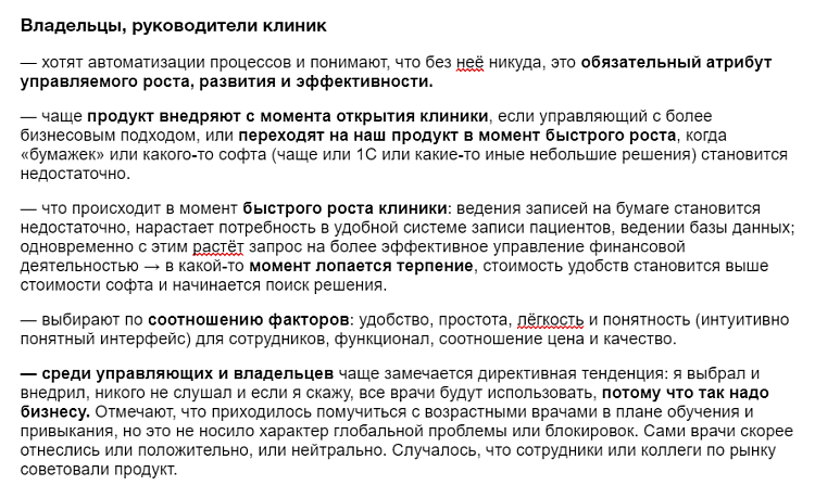 Помимо этого, мы напрямую выявляли потребности аудитории, ассоциации с брендом и конкурентами. Чтобы выявить ассоциации, использовали проективные метрики. Например, один из клиентов подсветил, что по простоте пользовательского опыта мы похожи на iPhone. Впоследствии и другие респонденты отнесли к преимуществам продуктов SQNS интуитивно понятный интерфейс. Этот аспект важен для конечных потребителей продукта — загруженных работой врачей.
