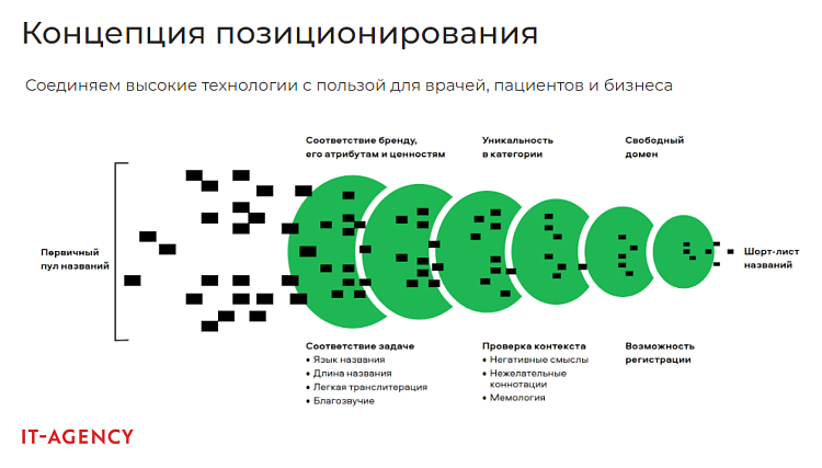 Схема отражает процесс выбора названия и показывает, как от множества идей мы перешли к короткому списку вариантов