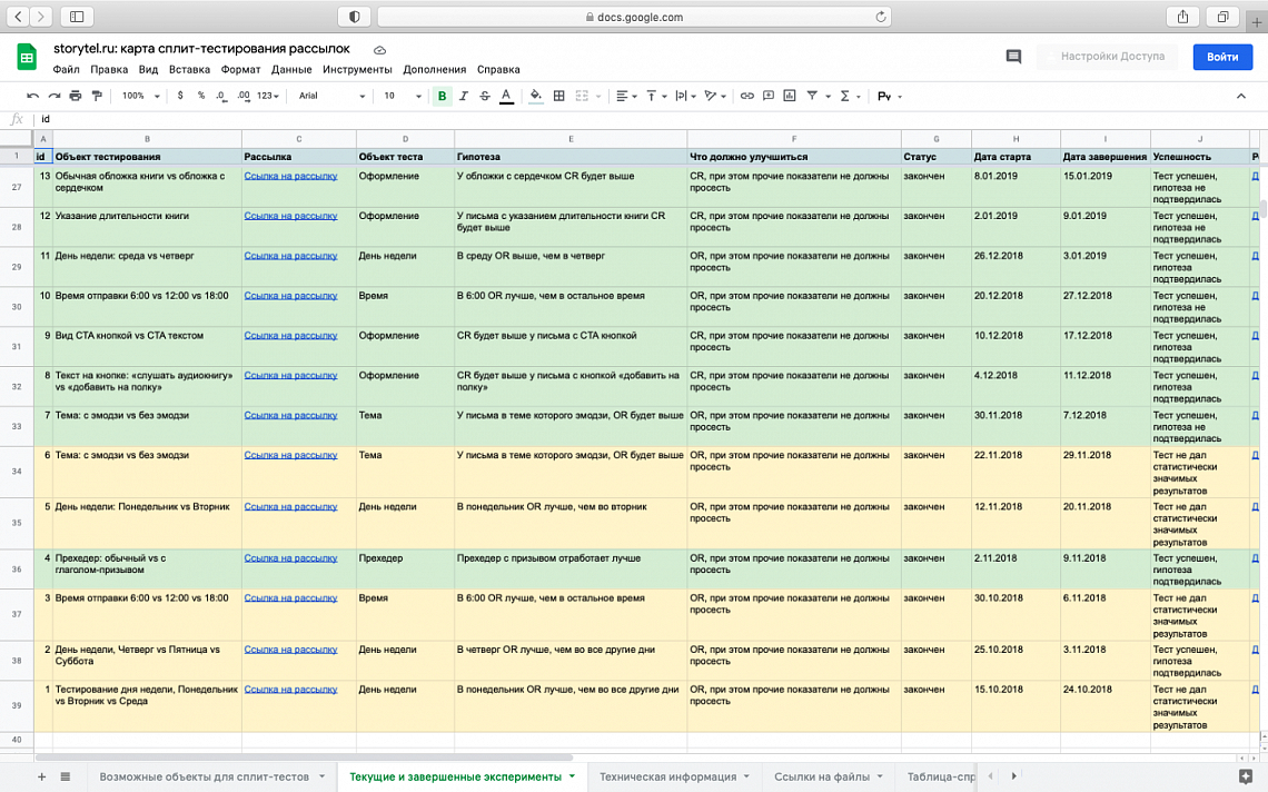 Карта сплит-тестирования: зелёным отмечены тесты, которые подтвердили или опровергли гипотезу, жёлтым — те, что не дали статистически значимого результата