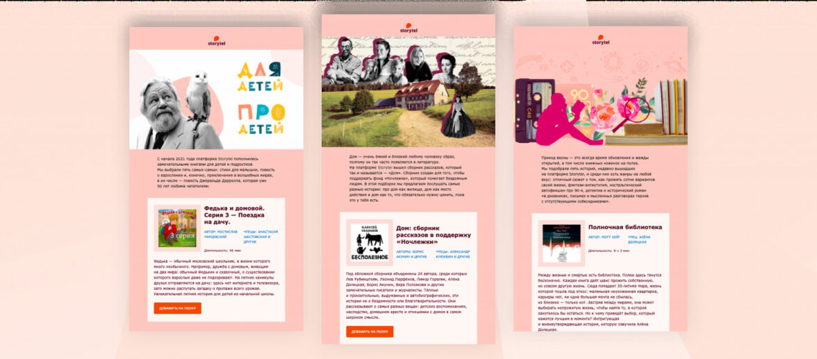На стороне клиента остаётся выбор темы и рекомендованных аудиокниг: команда лучше ориентируется в библиотеке и понимает, какие инфоповоды подсветить. Небольшую часть рассылок также пишут в Storytel — нам остаётся только вычитать, нарисовать обложку и сверстать письмо.