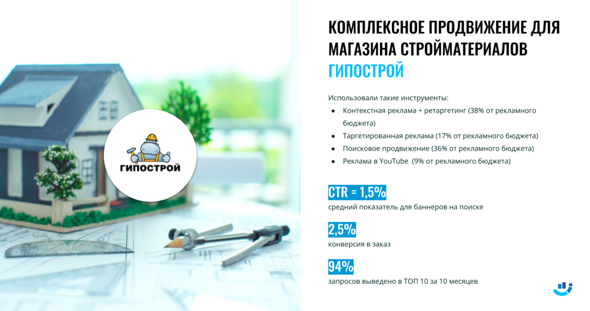 Клиент: Гипострой — магазин строительных и отделочных материалов по доступным ценам.