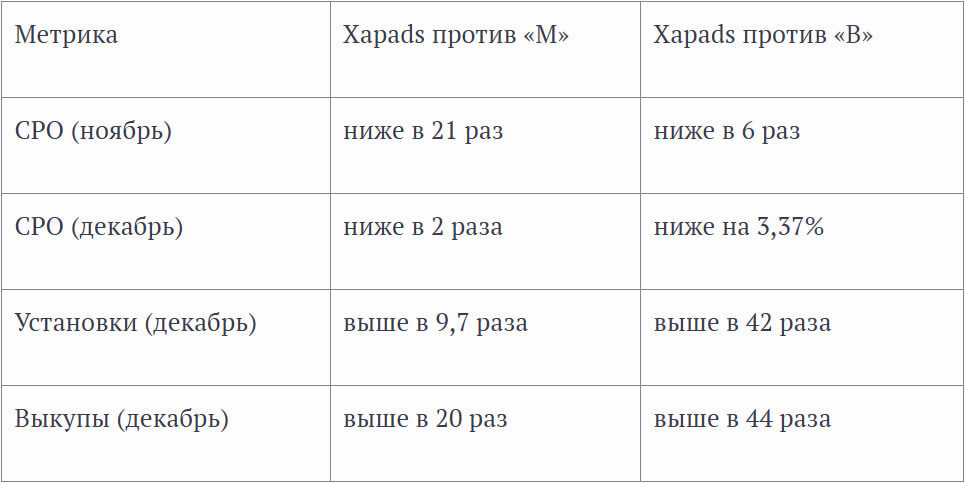 Сравнительная эффективность Xapads c другими источниками по ключевым метрикам.
