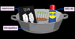 Когда мы рисовали иллюстрации для основного текста, мы работали по принципу «подкрепляем зрительно то, что описано в письме». Так, вместо простого алюминиевого таза, появилась композиция из таза, лампочек, батареек и популярного средства на все случаи WD‐40.