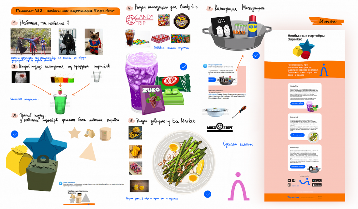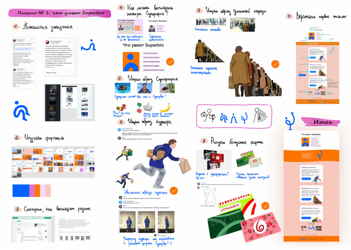 Так выглядит процесс работы над первым письмом. Сначала мы изучили фирменный стиль компании, после поговорили с клиентом о том, как он видит дизайн писем и приступили к отрисовке макетов. На иллюстрации виден путь поиска хорошей идеи: сперва мы хотели написать письмо от лица Супермена, а потом поняли, что лучше введём в рассылку своего собственного героя