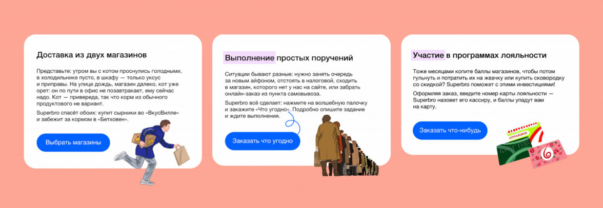 Ещё нам было важно через визуал показать, что Superbro помогает экономить время, поэтому многие изображения динамичны: курьер бежит, карточки летают. Дополнительный акцент на движение делает вёрстка, все иллюстрации выходят за пределы текстового блока.