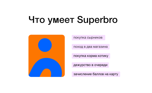 Вместо обычного списка с навыками типа стрессоустойчив, многозадачен и дальше по списку, мы перечислили то, что умеют делать курьеры Superbro: покупать сырники, приносить кошачий корм, стоять в очереди