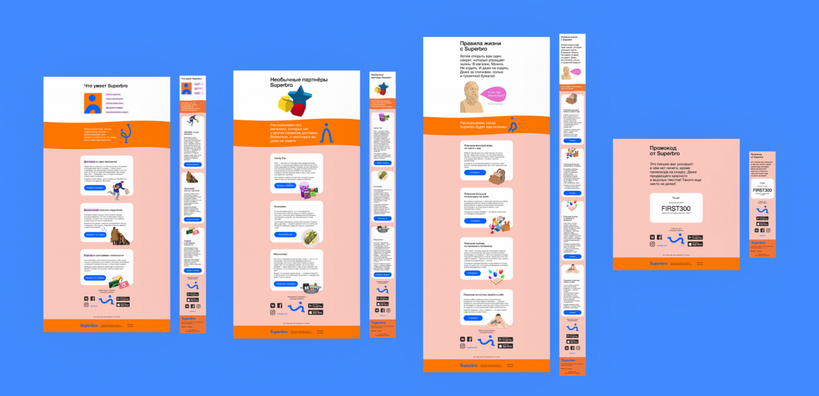 Superbro обратились к нам за разработкой базы для CRM-маркетинга. В рамках этой задачи нам нужно было сделать дизайн welcome-цепочки. Цель welcome-цепочки — рассказать новым клиентам, что Superbro — это не очередная служба доставки, а что-то более функциональное.