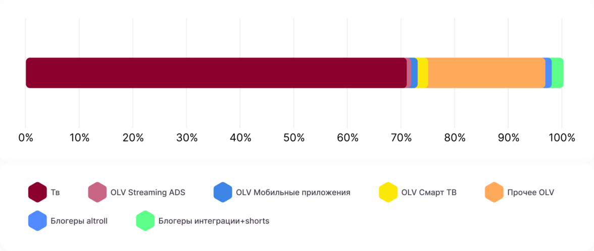 До 2024 года бренд в основном запускал охватные флайты на ТВ и в онлайне с высокими весами. А с 2024 года усилил свою digital-коммуникацию, увеличил качество контакта OLV, подключил эффективные форматы на Смарт ТВ, streaming ads и рекламу в мобильных приложениях. В рамках кампаний с блогерами использовались альтроллы, интеграции и shorts.