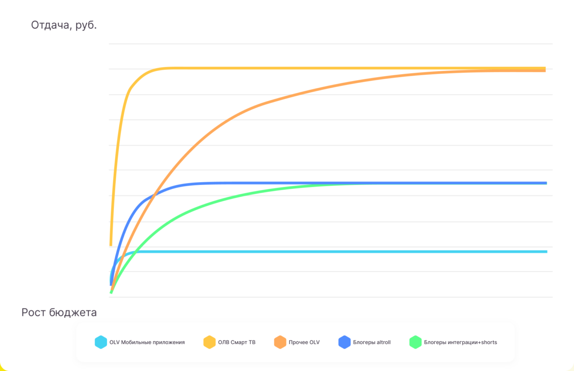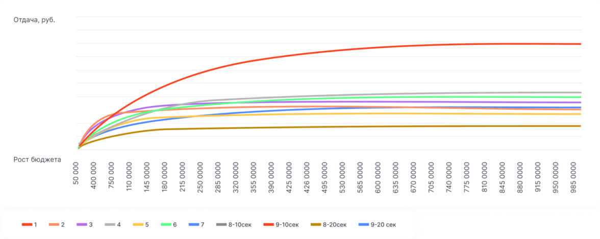Каждый креатив по-разному накапливает свою отдачу. Это помогает понять предельный бюджет флайта в зависимости от типа креатива и хронометража ролика.