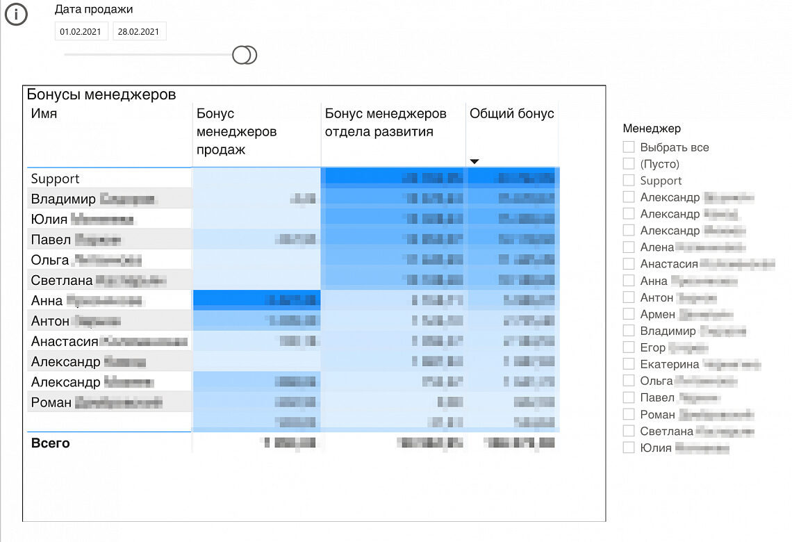 Третий отчёт — бонусы менеджерам. Его я использую для расчёта мотивации ежемесячно.