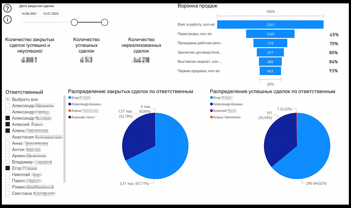 Самое полезное в этом отчёте — фильтр по распределению закрытых и успешных сделок по менеджерам, потому что он сразу показывает, кто и как отработал за выбранный период.