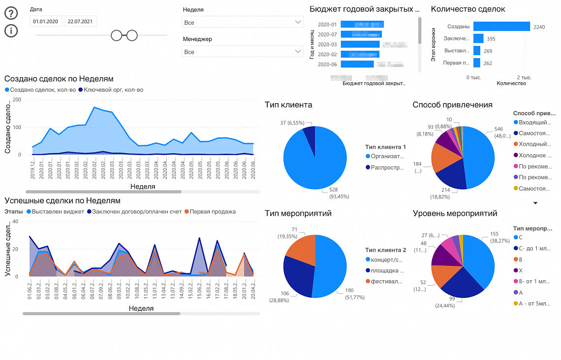 Так как эти системы не были связаны между собой, нужные отчёты собирались вручную. Иногда это приводило к тому, что какие-то цифры терялись или не совпадали, а создание простого отчёта могло занять несколько часов. Нас позвали, чтобы мы свели данные о продажах Ticketscloud и клиентов компании в единый прозрачный отчёт, который показывает эффективность работы менеджеров.