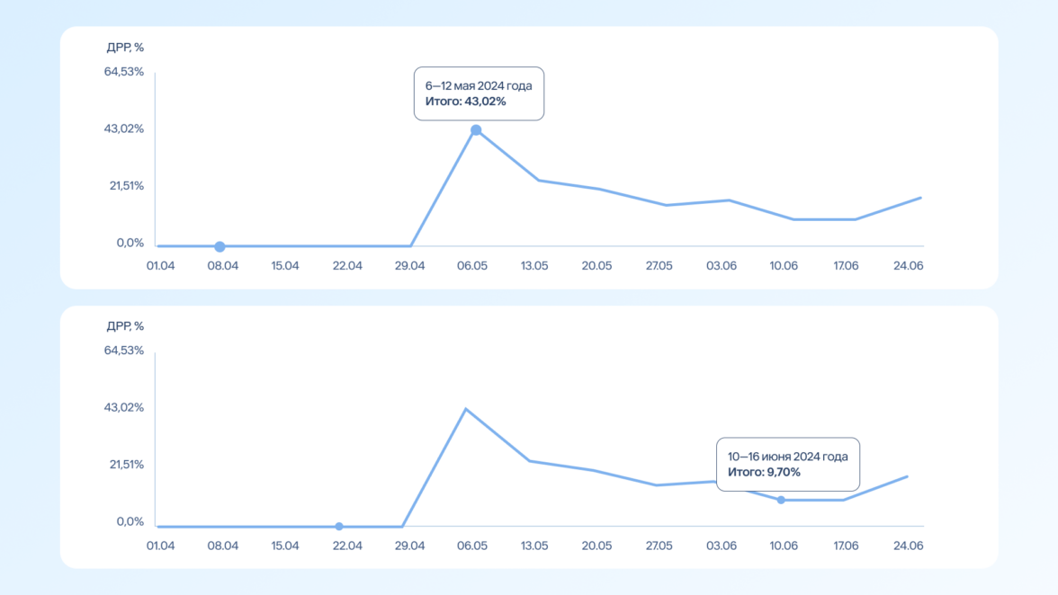 Помогли клиенту заметно снизить долю рекламных расходов (ДРР). На графиках ниже показано сравнение ДРР до и после имплементации — разница почти в 4,5 раза.