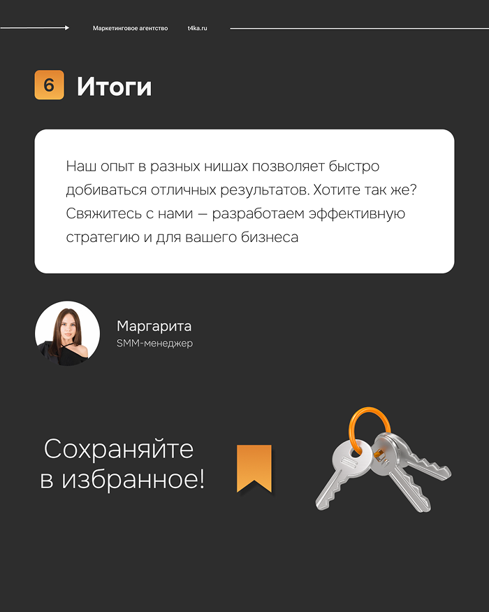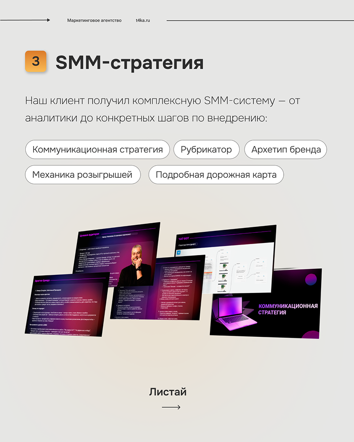 По итогу разработки стратегии наш клиент получил комплексную SMM-систему — от аналитики до конкретных шагов по внедрению: