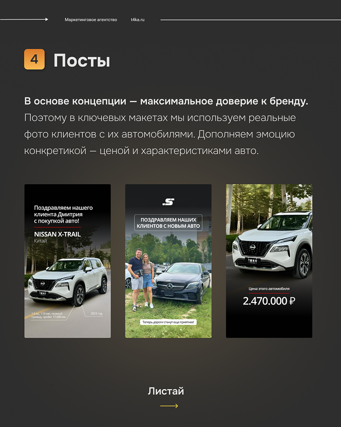 1) Как мы усилили доверие через реальные лица клиентовВ основе концепции — максимальное доверие к бренду. Поэтому в ключевых макетах мы используем реальные фото клиентов с их автомобилями: это сильное социальное доказательство, которое показывает, что компания действительно доводит сделки до результата. Дополняем эмоцию конкретикой — ценой и характеристиками авто. Такой баланс «живых» историй и понятных цифр снижает скепсис, делает бренд ближе и помогает потенциальным клиентам легче представить себя на месте героев постов.