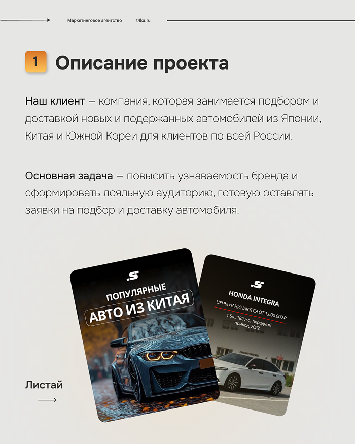 ПРОБЛЕМАНе было стратегии, регулярного контента и четкого образа бренда. На фоне недоверия к рынку авто «из-за границы» и активных конкурентов это тормозило рост и мешало превращать онлайн-аудиторию в новые заявки.