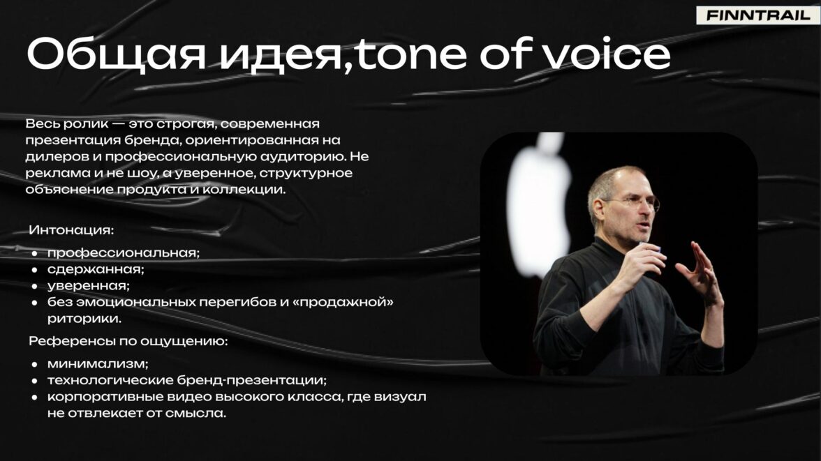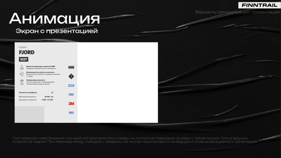 Ролики создавались при участии FINNTRAIL как часть предзаказной кампании и должны был использоваться в прямой трансляции для дилерской сети. Это не просто видео — а B2B-инструмент продаж: через него клиент презентовал новую коллекцию, доносил ценность продуктов и помогал партнёрам принимать решения о формировании ассортимента на сезон. Целевая аудитория — крупные дилеры, байеры и руководители торговых направлений.