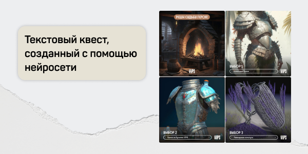 В проекте использовали нейросети. Оживили формат текстовых квестов (тех самых, где игрок выбирает вариант, который влияет на судьбу героя) — обогатили его нейросетью-рассказчиком. Все варианты ответов, история и картинки в квесте были созданы нейросетями.