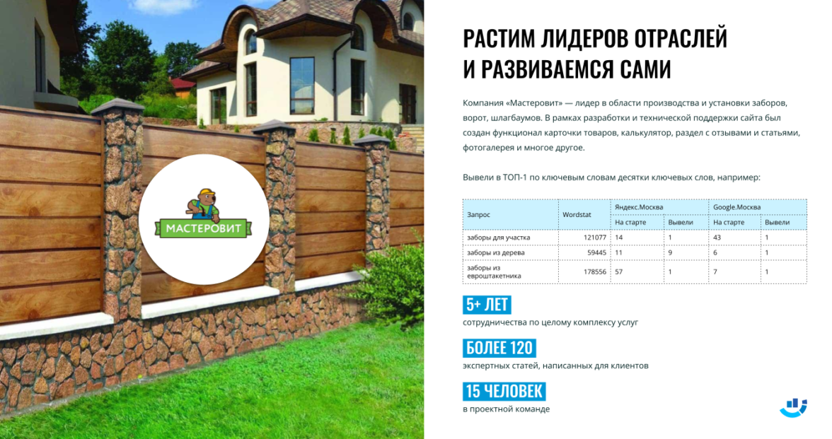 А для тех, кто хочет убрать все любопытные взгляды от своего жилья, наш клиент «Мастеровит» ставит надёжные ограждения. «Мастеровит» — лидер в области производства и установки заборов, ворот и шлагбаумов на протяжении 24 лет. У компании есть 3 производственные базы, оснащённые современным оборудованием.