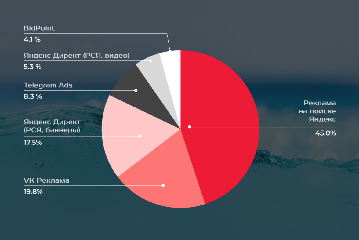 Сплит рекламной кампании сформировался из источников, которые уже хорошо себя зарекомендовали: Поисковая реклама в Яндекс Директ и РСЯ (баннеры и видео). Дополнительно в качестве теста запустили: «VK Рекламу», Telegram Ads, программатик-платформу BidPoint.