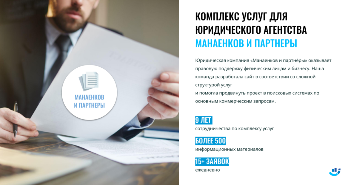 В середине нулевых к нам обратилась юридическая компания «Манаенков и партнёры», которая оказывает правовую поддержку физическим лицам и бизнесу. Наша команда разработала для них сайт в соответствии со сложной структурой услуг и помогла продвинуть проект в поисковых системах по основным коммерческим и более 1000 информационных запросов.