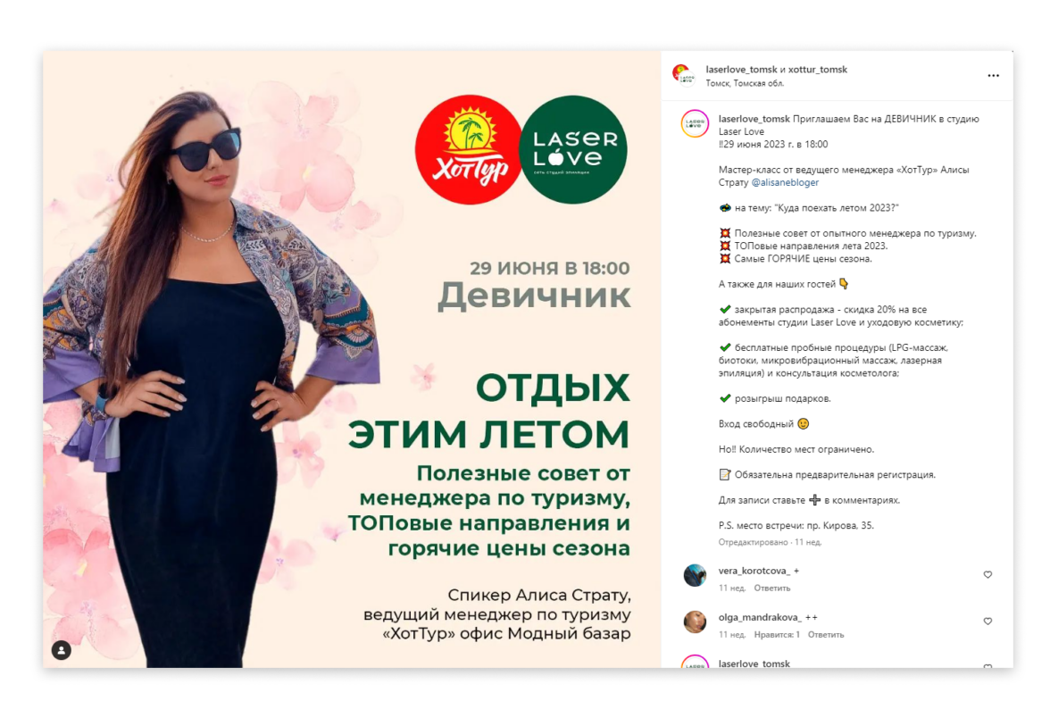 Коллаборации — совместные публикации с другими компаниями для привлечения внимания друг к другу. Один из последних примеров: недавно проводили девичник со спикером из компании ХотТур и анонс мы опубликовали в коллаборации с ними. Подобные коллаборации проводим регулярно.