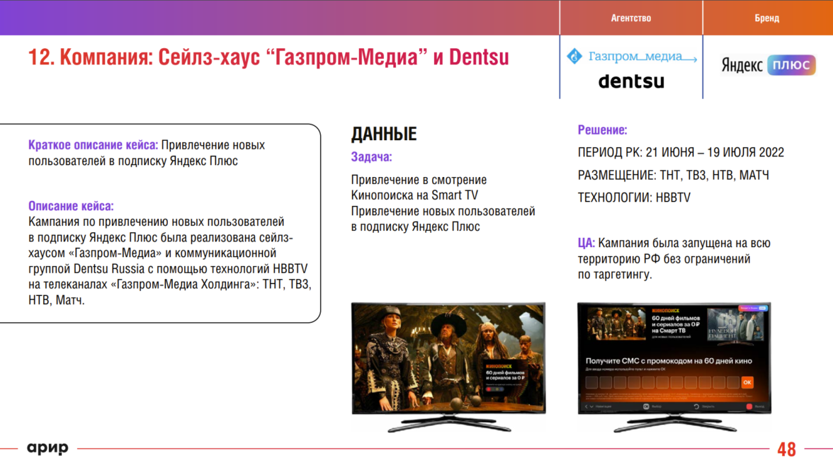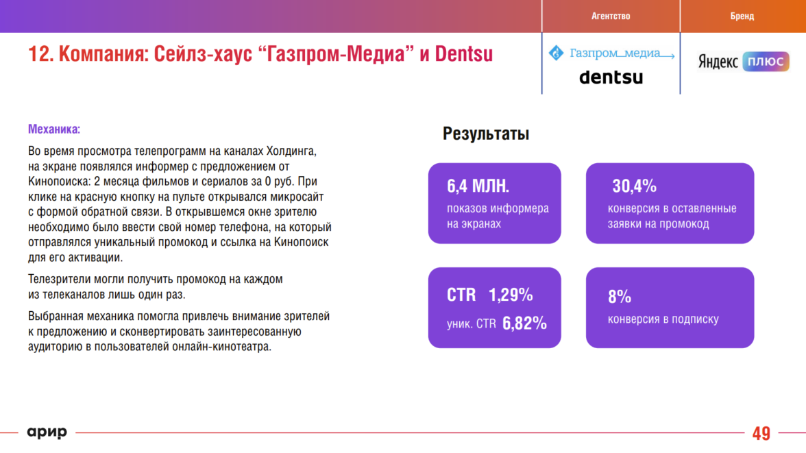 В подготовке кейсбука приняли участие ведущие игроки отрасли. В том числе в экспертный документ вошел проект сейлз-хауса «Газпром-Медиа» и коммуникационной группы Dentsu Russia (OKKAM) о привлечении новых пользователей в подписку Яндекс Плюс.