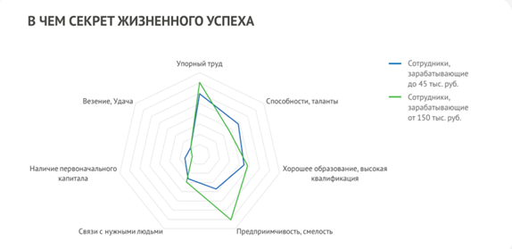 Также заметна разница в отношении к смене работы: сотрудники с низкими доходами чаще ищут новые возможности, тогда как высокодоходные стремятся к долгосрочной занятости. Восприятие успеха у них тоже различается: низкодоходные связывают его с упорным трудом, способностями и хорошим образованием, а высокодоходные в равной степени – с трудолюбием и предприимчивостью.