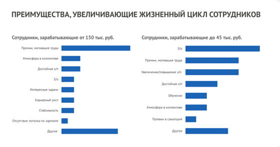 Отдельный исследовательский интерес в рамках проекта представлял анализ различий между сотрудниками с самыми низкими и самыми высокими доходами. Эти две группы составили по 8% от общей выборки. Сотрудников с разным уровнем дохода объединяют ключевые факторы, способствующие увеличению продолжительности работы в компании: достойная зарплата, система премирования, мотивация труда и комфортная атмосфера в коллективе. Однако для работников с доходом до 45 тыс рублей решающим фактором остается перспектива увеличения заработной платы.