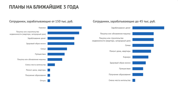 Различаются их жизненные приоритеты. Высокодоходные сотрудники ориентированы на карьерный рост и ведение здорового образа жизни, в то время как для низкодоходных в приоритете остаются финансовая стабильность, забота о семье. Приобретение или строительство жилья является объединяющим фактором.