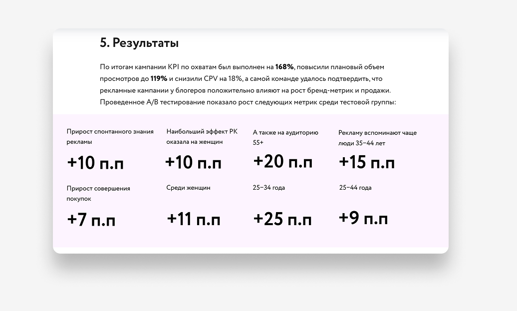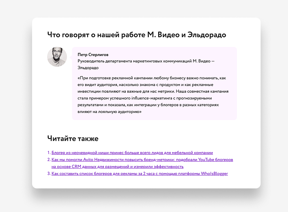 «Работа выстроена логично, с четкими этапами и оперативной коммуникацией. Финальный результат полностью соответствует ожиданиям, при этом команда была гибкой в случае необходимости правок на последнем этапе.Хотелось бы больше проактивности на этапе брифа — предложений по подаче кейсов, чтобы разнообразить формат. Также было бы полезно больше экспертных рекомендаций по тем подходам, которые, исходя из вашего опыта, дают наилучшие результаты.Отдельно хотелось бы отметить оформление: было бы здорово усилить визуальную подачу, особенно в части акцентов на конкретных результатах. Учитывая ваш опыт, ожидается чуть больше компетенций именно в этом аспекте. В целом, работа на высоком уровне!», — Лев Грунин, CEO WhoIsBlogger.