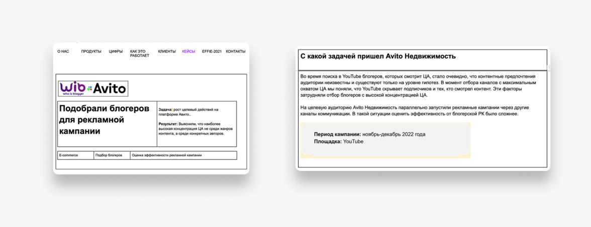 WhoIsBlogger — это экосистема решений для работы с блогерами, основанная на Big Data. Их продукты помогают находить блогеров с аффинитивностью к целевой аудитории, анализировать рекламу конкурентов, собирать подборки инфлюенсеров и оценивать влияние на продажи. Компания сотрудничает с лидерами рынка, такими как Билайн, Яндекс, МТС и X5. К нам они обратились с задачей: публиковать кейсы на сайте и адаптировать под vc.ru. Первым этапом предстояло подготовить страницу для их размещения.
