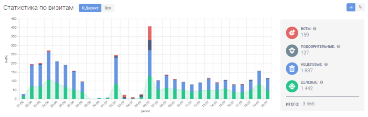 За месяц из Я.Директ проанализировали 3,5 тыс. визитов, из них было зафиксировано 286 мошеннических (8%).