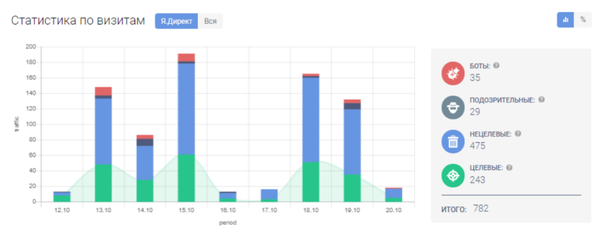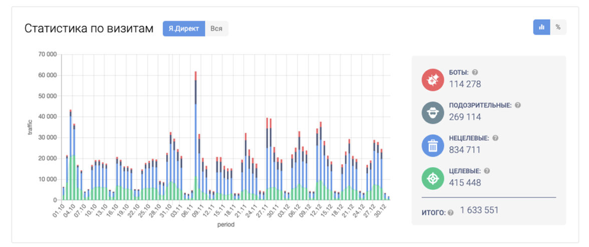 Анализировали весь входящий трафик и проверяли переходы из Яндекс Директ. Было проанализировано 3,5 тыс. визитов, 286 из которых оказались мошенническими.