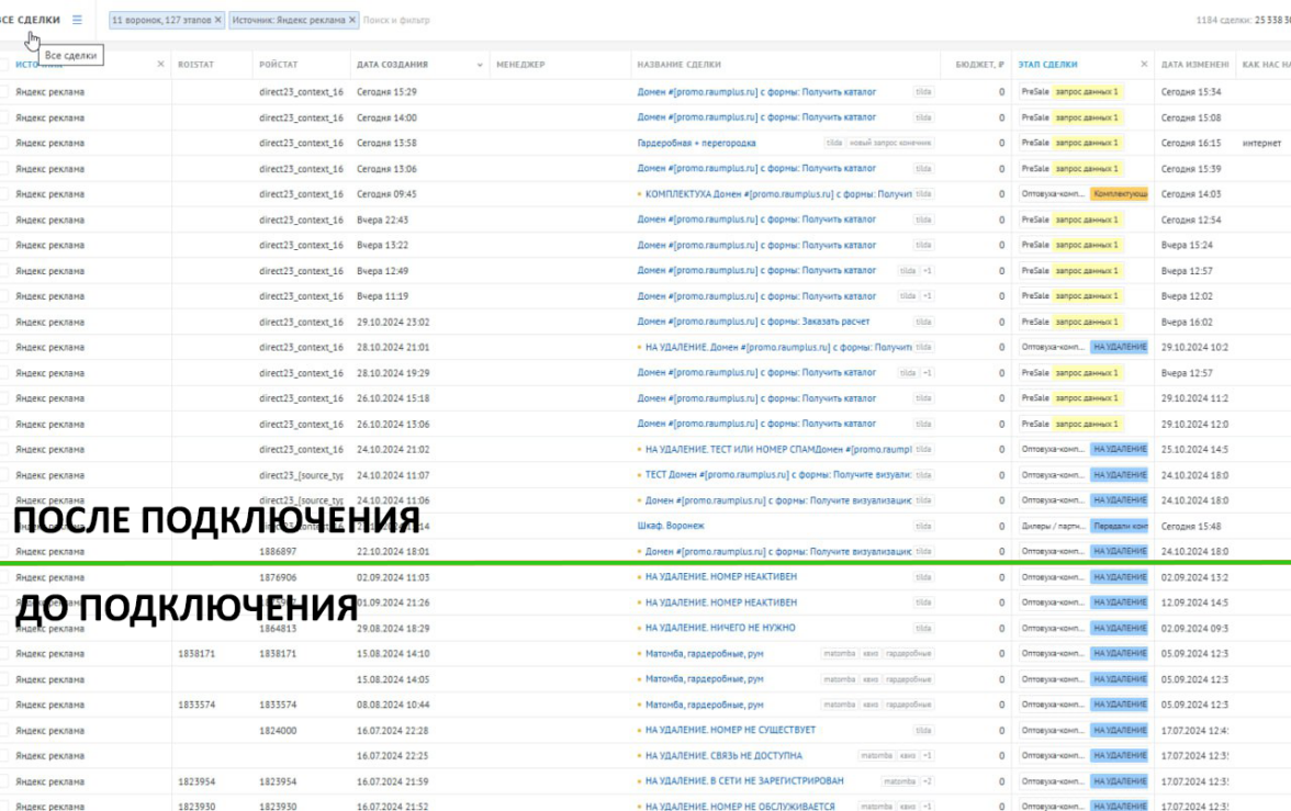 Вот скрин из CRM-системы клиента, который наглядно показывает качество заявок до подключения сервиса антифрода Botfaqtor и после: