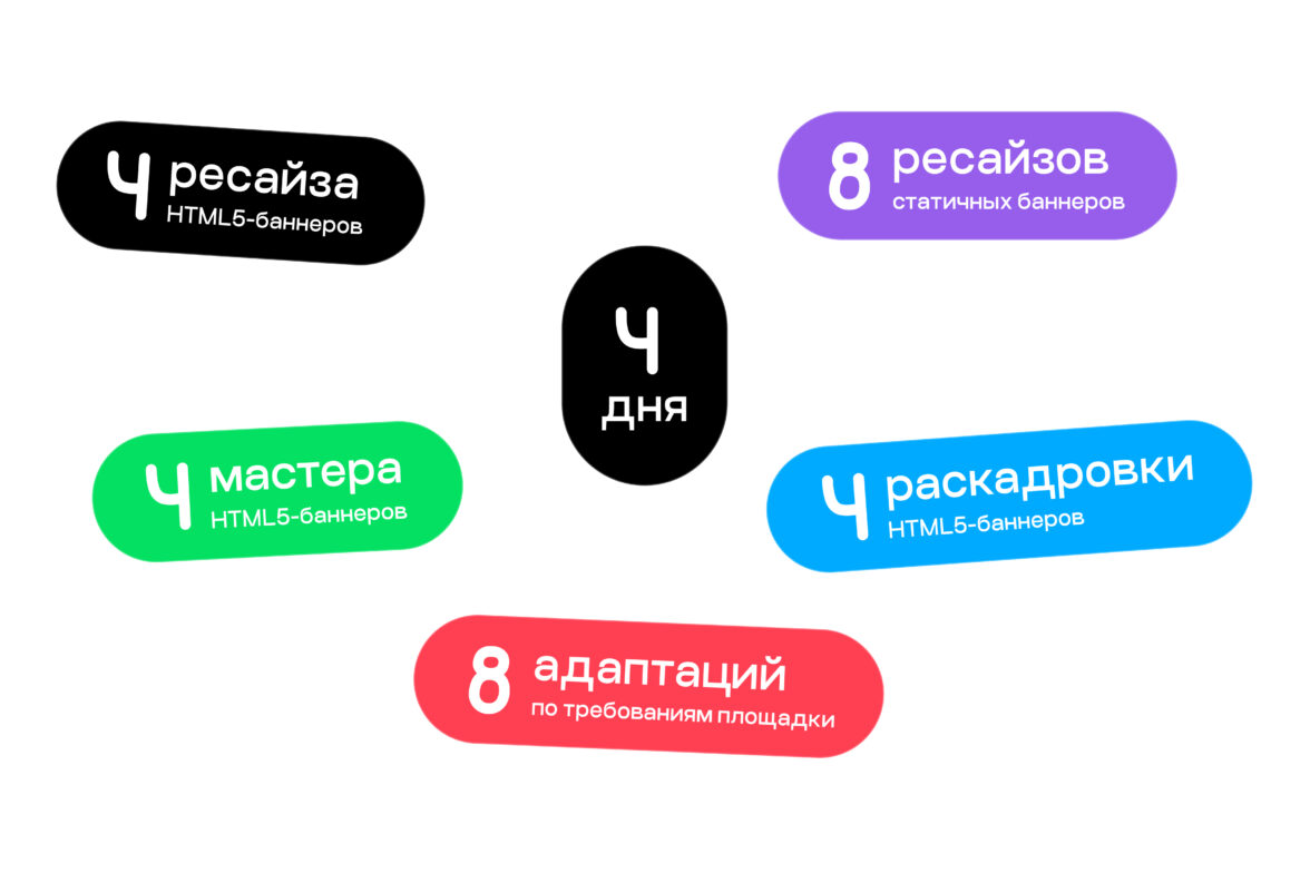 В итоге подготовили 4 пака баннеров, в каждом из которых было по 2 HTML5-баннера — один для десктопа, другой для мобильной версии — и 2 статичных баннера.