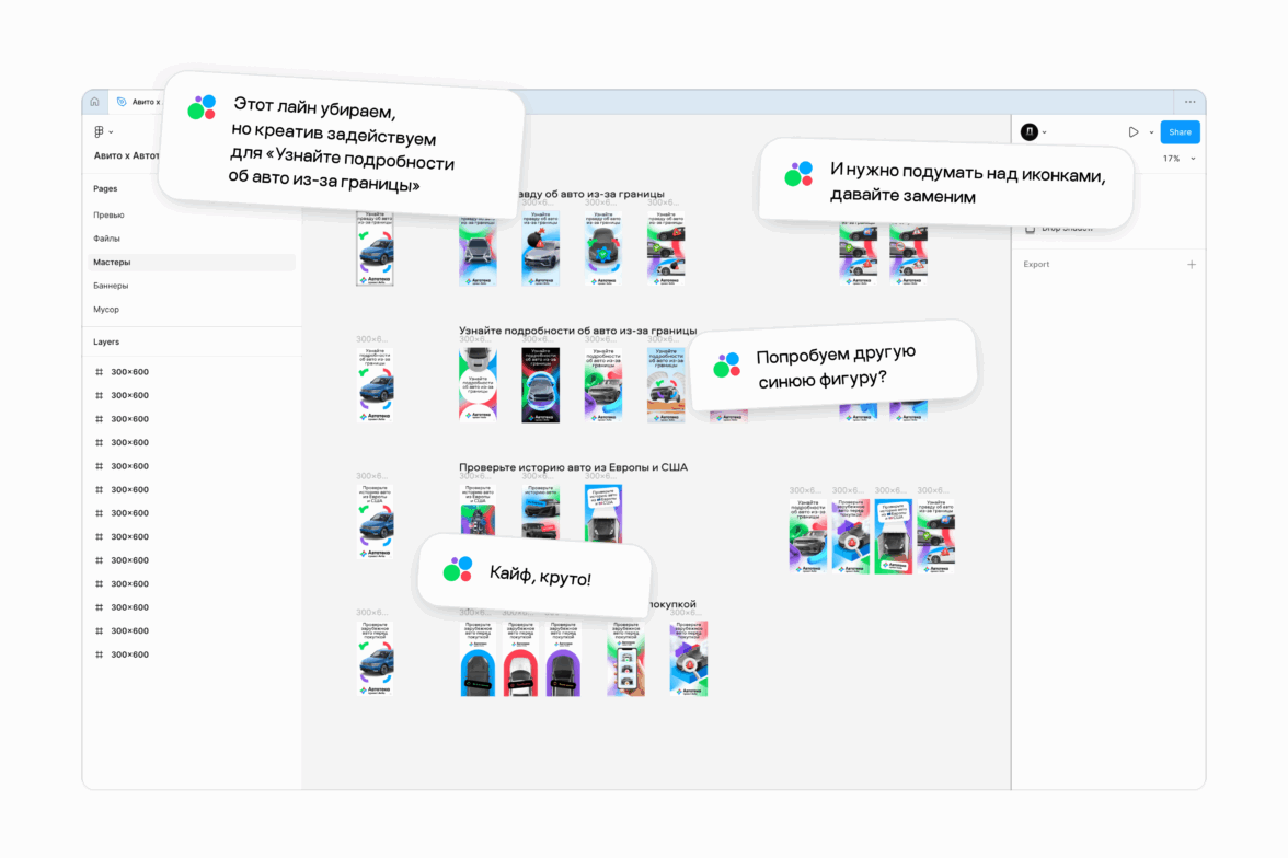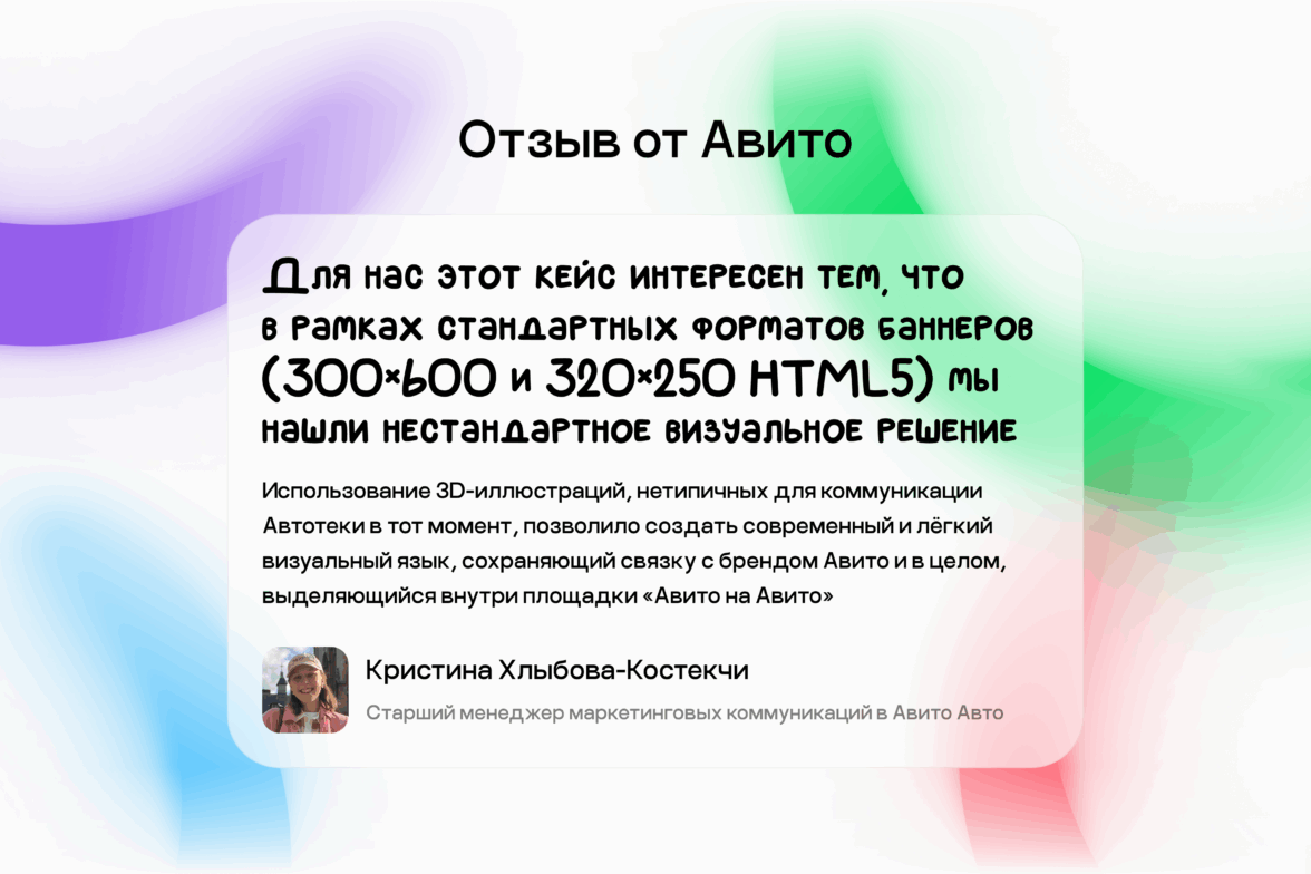 Уложились в поставленные сроки, сдались за неделю со всеми правками и дополнениями. Ребята из Авито Авто остались довольны и спустя время вернулись с похожей задачей. А мы были только рады — формат, когда креатив создаётся с нуля, нам особенно интересен.