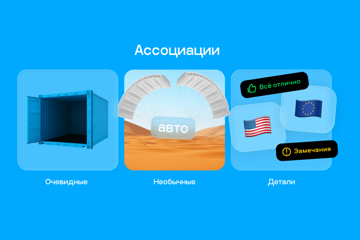 Стали визуально обыгрывать каждую фразу. Так как авто доставляется из-за границы, возникли и классические ассоциации с контейнерами для перевозки, и необычные, где машина приземляется в пустыню с парашютом. К лайну с упоминанием США и Европы просились флаги, а само слово «заграница» можно было обыграть с помощью изображений, например пустыни. «Узнать правду об авто» — значит, быть в курсе возможных проблемных моментов, а их тоже можно визуализировать значками.