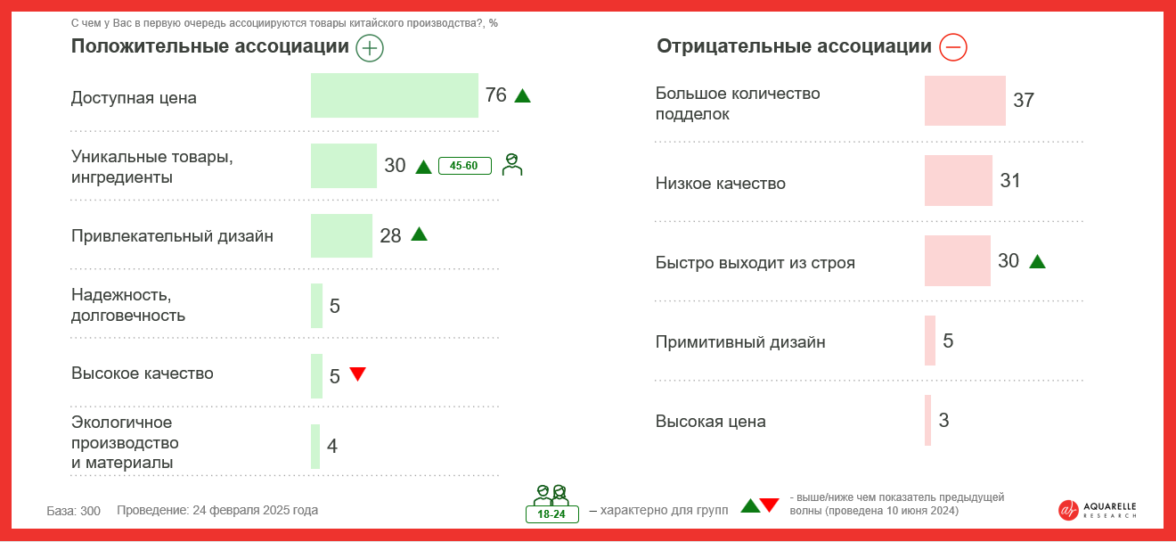 Однако сохраняются сомнения относительно качества продукции. Товары китайских брендов стали больше ассоциироваться с доступной ценой (76%), уникальностью (30%), привлекательным дизайном (28%).