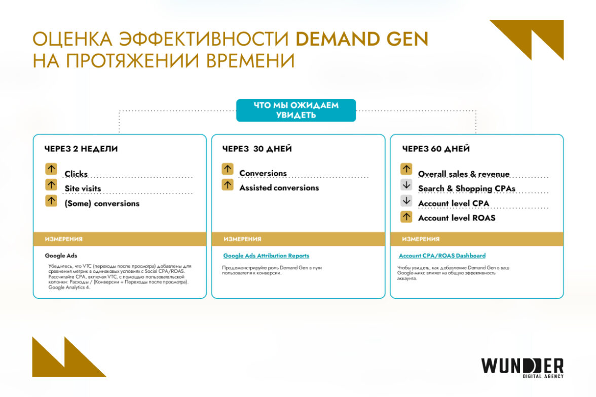 3. Общая эффективность аккаунта: зафиксируйте, как добавление Demand Gen в Google-микс влияет на общий CPA/ROAS аккаунта.