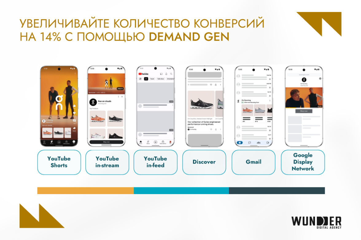 Demand Gen позволяет создавать спрос там, где его еще нет и плавно переводить пользователя к покупке. Расширение аудитории происходит за счет AI и поведенческих сигналов, а подогревать интерес помогают персональные визуальные креативы и фиды. По итогу бренд получает рост продаж не за счет бюджета, а благодаря более «подготовленному» пользователю. Кампании Demand Gen позволяют размещать объявления во всем многообразии форматов: YouTube (в форматах in-stream, Shorts и in-feed), в ленте Discover, Gmail и Google Display Network.
