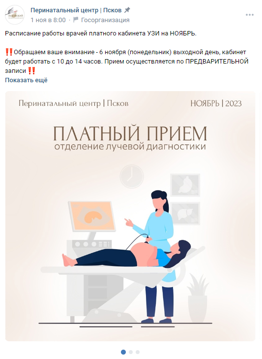 Ну и возвращаясь к тому, с чего начинали — клиентский сервис. Обращается человек по ОМС или за платными услугами — нет никакой разницы. Даже минимальные изменения в части сервиса и упрощения получения услуг творят чудеса. Например, мы с первого месяца работы ввели простое правило — в начале месяца в сообществе ВК закрепляется пост с расписанием работы платного кабинета УЗИ на месяц и простой формой записи на услуги. Услуга очень востребована, при этом шли постоянные жалобы на невозможность дозвониться и записаться. С появлением дополнительного канала записи (когда человек оставляет данные, а оператор ему перезванивает и подтверждает дату и время записи) нам удалось разгрузить линию и увеличить объем оказываемых услуг почти в два (!) раза.