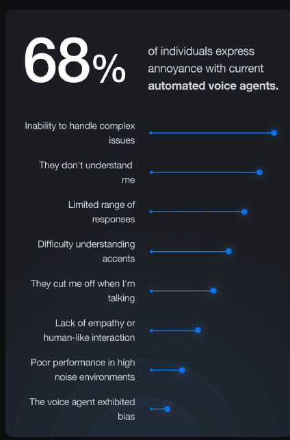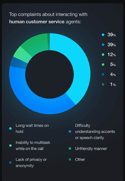 При этом, согласно опросу, проведенному Сentiment (представляет аутсорсинговые услуги колл-центров) по заказу компании-разработчика голосовых ассистентов Tenyx, 67% клиентов, обращающихся в колл-центр, предпочитают говорить с человеком, а 30% всегда разговаривают только с человеком. Только 3% опрошенных заявили, что предпочитают говорить с автоматическим помощником.