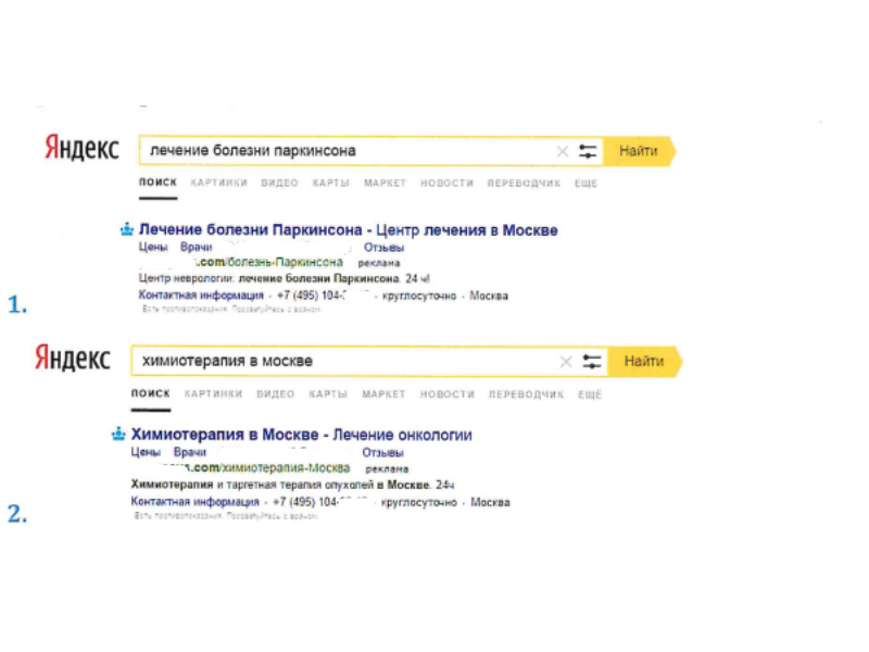 Медицинская тематика ограничивает некоторые рекламные активности при продвижении. Например, модерацию, вероятнее всего, не пройдут объявления, содержащие фразы «диагностика», «курс лечения», «терапия», «уход», «консультация», «прием» и др.) Google пристально следит за продвижением сайтов YMYL (Your Money or Your Life) тематики, а также в обеих системах установлен запрет на использование названий диагнозов в рекламных текстах;