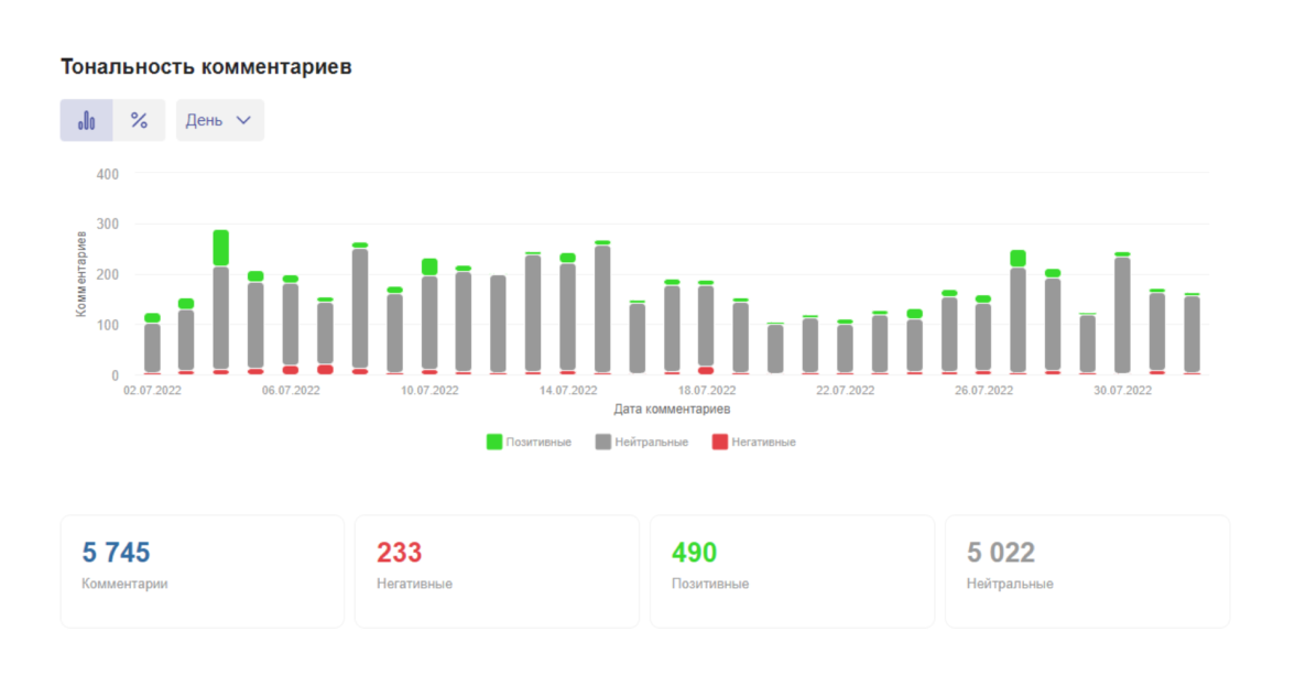 По графикам вы можете отследить, когда произошел всплеск негативных / позитивных комментариев. Сортируйте комментарии и отрабатывайте негативные в первую очередь. Так вы сможете держать ситуацию под контролем и оперативно закрывать возражения аудитории.