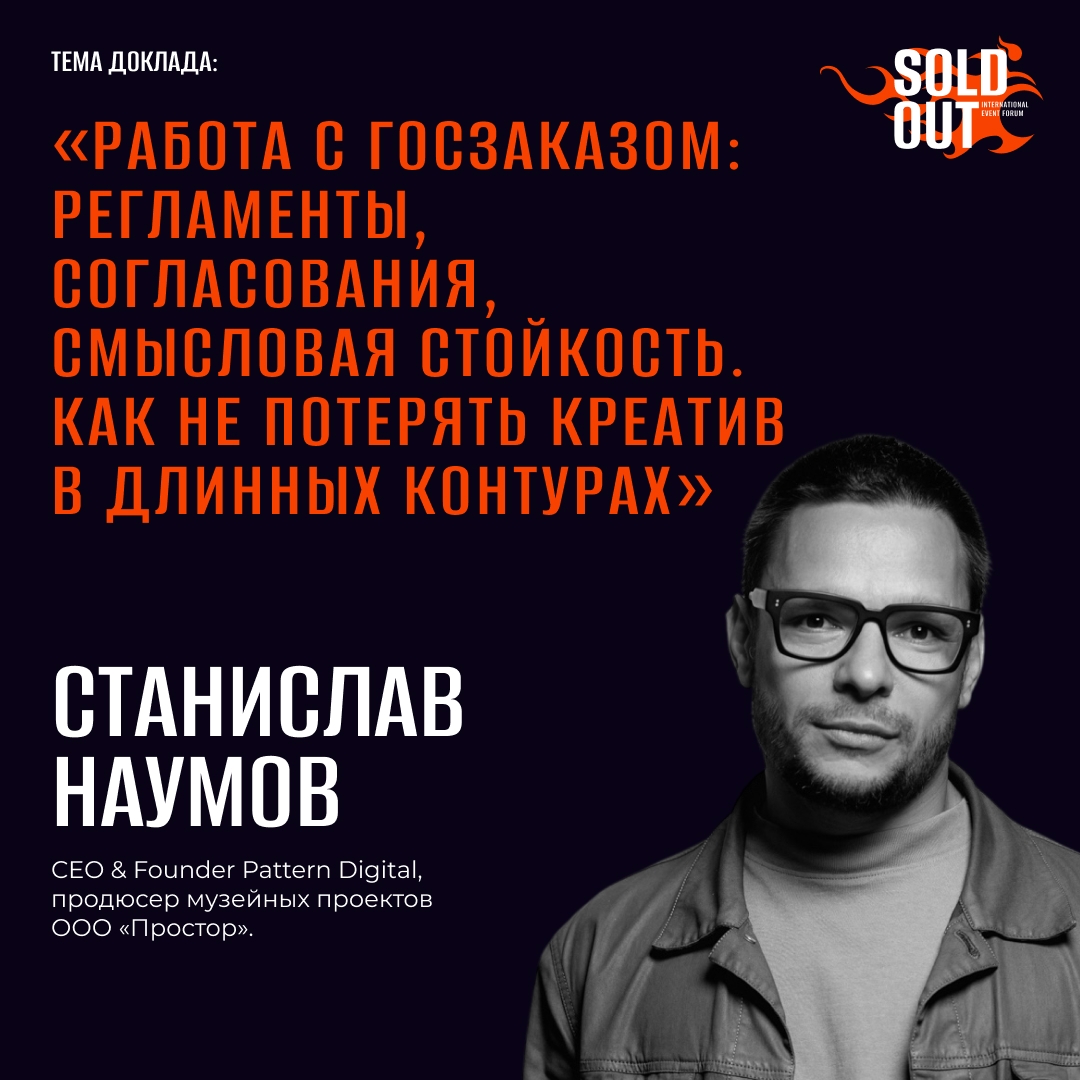 Станислав Наумов, Генеральный директор / креативный продюсер Pattern Digital, выступит на форуме с темой: «Работа с госзаказом: регламенты, согласования, смысловая стойкость. Как не потерять креатив в длинных контурах».