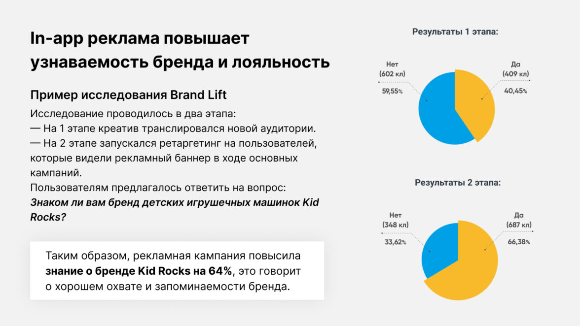 Во-вторых, более 5 млрд человек в мире используют мобильные приложения ежедневно. В среднем пользователи проводят в них около 3,5–5 часов в день. Поэтому мобильная реклама обеспечивает постоянное присутствие бренда в поле зрения аудитории. Это напрямую влияет на узнаваемость и запоминаемость. Это подтверждают Brand Lift исследования.